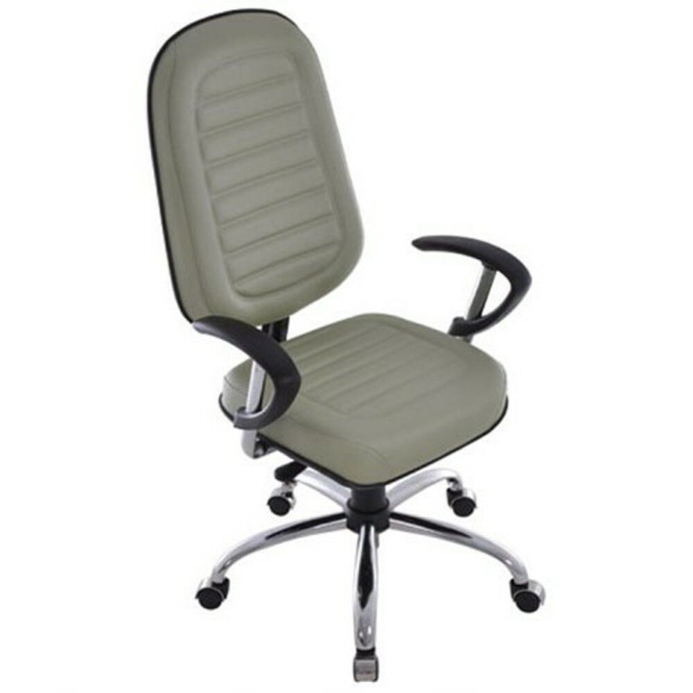 Cadeira Presidente giratória ergonômica de fabricação nacional com encosto anatômico, sendo estrutura giratória em aço a gás , o mecanismo dessa cadeira é gás, que proporciona a regulagem de altura do assento , com estrela , braços fixos , e com rodízios , espuma anatômica injetada com espessura de incríveis 70 mm no assento e 70 mm no encosto gomada.