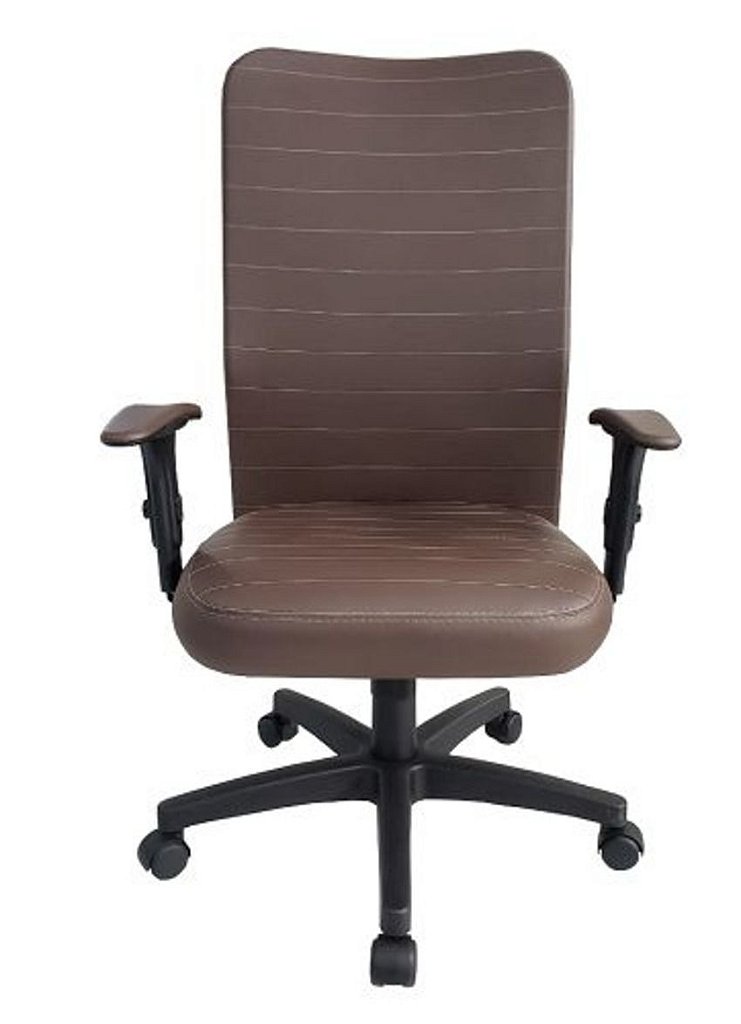 Poltrona Presidente Gomada com base relax ,com braços reguláveis e apoio de braços revestido na cor marrom.