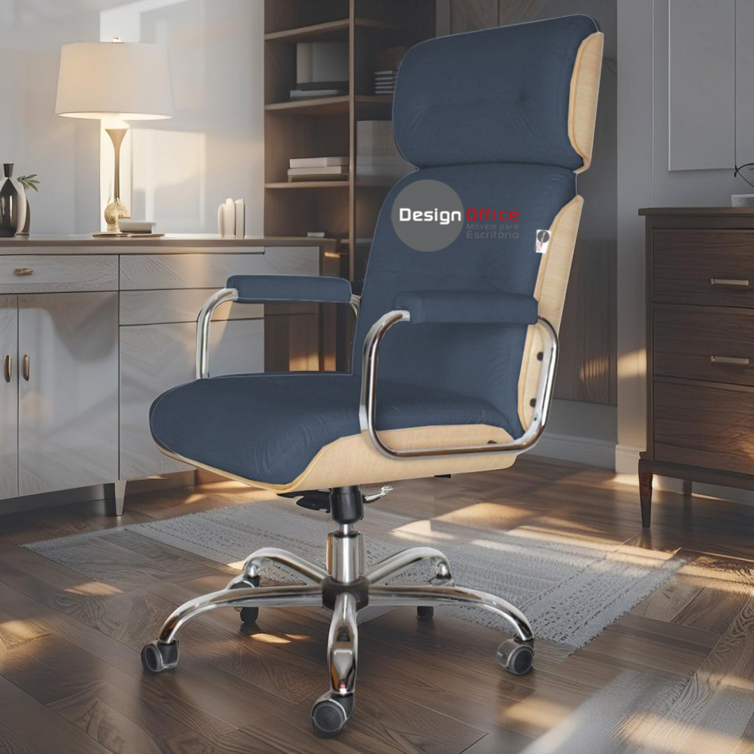 Cadeira Presidente Eames Linha Capa em Madeira Clara - Cor: Azul Marinho - Tonalidade da Cor: Azul Marinho -Marca: Design Office Móveis - Estrutura: Cromada - Tonalidade da Madeira: Clara - Modelo: Presidente